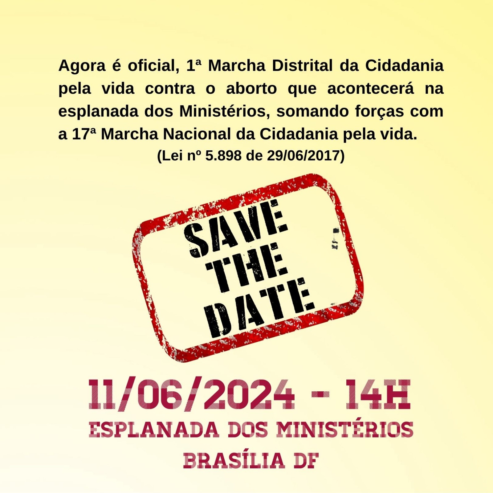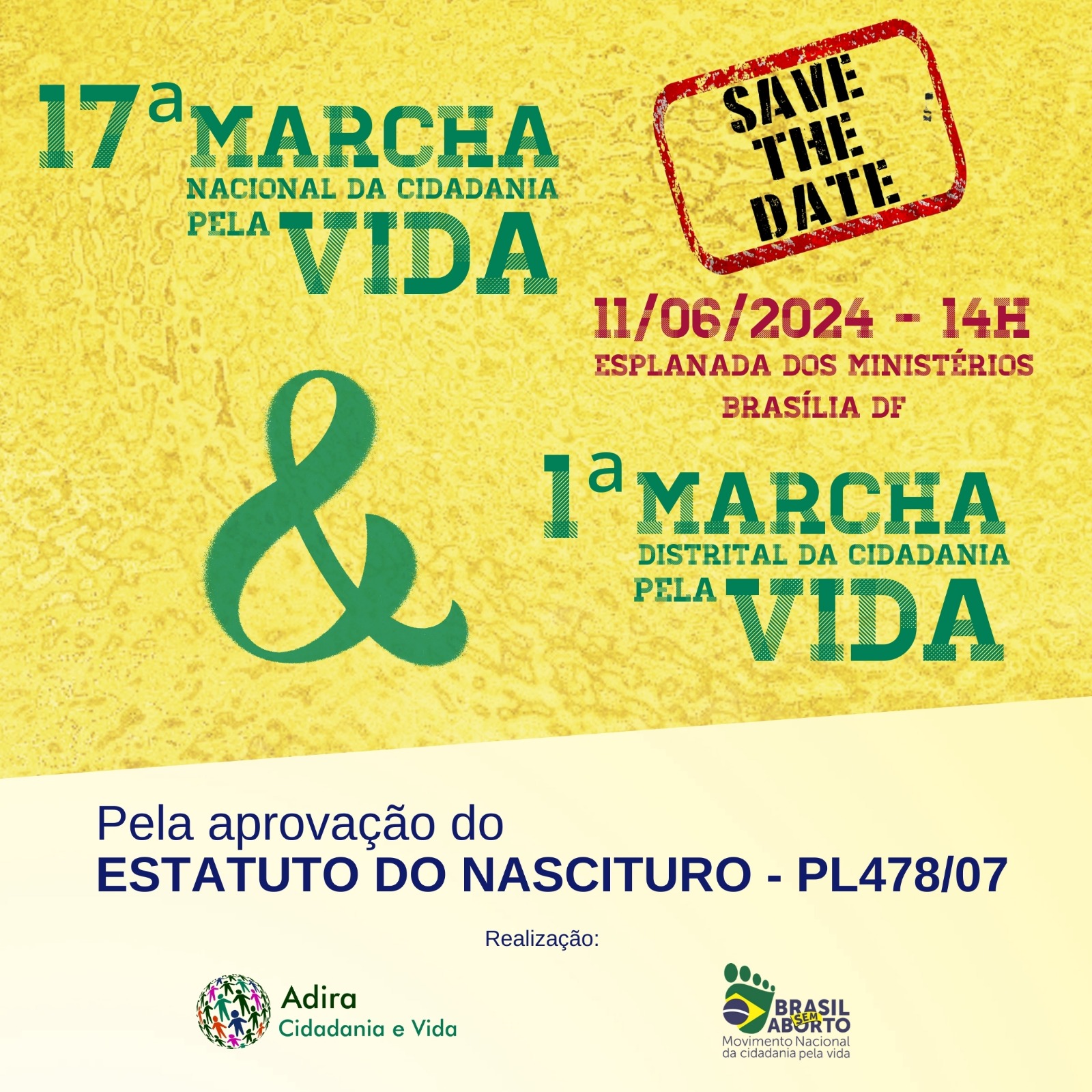 A 17ª edição da Marcha Nacional pela Vida será realizada no dia 11 de junho, em Brasília, a partir das 14h, na Esplanada dos Ministérios. Neste ano, a mobilização será reforçada com a realização simultânea da 1ª Marcha Distrital pela Vida. Com o tema A Marcha pela Vida inicia na fecundação!, o Movimento Nacional Brasil Sem Aborto busca reforçar o marco inicial da vida humana na fecundação. A mobilização apresenta como pautas principais a aprovação do Estatuto do Nascituro (PL 478/2007) e aprovação do Projeto de Lei 1.096/2024, que proíbe o procedimento de assistolia fetal.